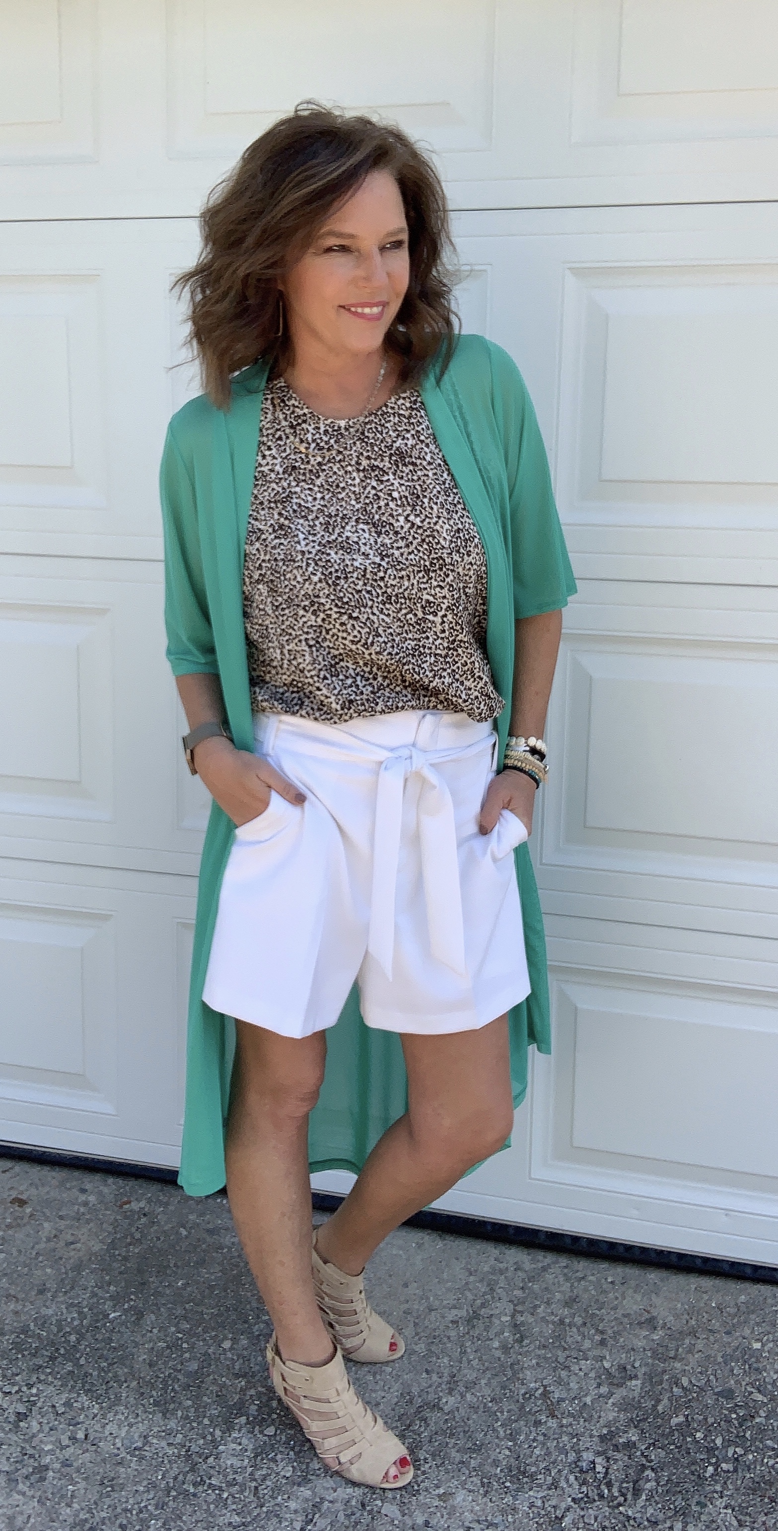 Animal print is huge again this season and I am partial to leopard print. I can do snake print, but I have not found anything that tripped my trigger yet. Last week I was at Old Navy and picked up this cute leopard tank, so I thought I would style it 3 different ways. There are so many options when it comes to leopard, don’t limit yourself – go crazy with some color! I opted to style it with white shorts and a cute pair of strappy sandals.
